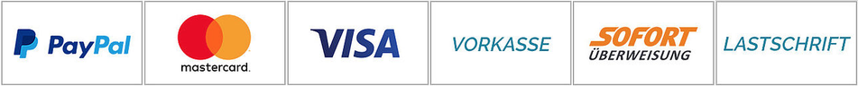 Bezahlen Sie bequem und sicher mit Kreditkarte (Visa, Mastercard, Amex), Paypal, per Sofortüberweisung oder mit Vorkasse.
